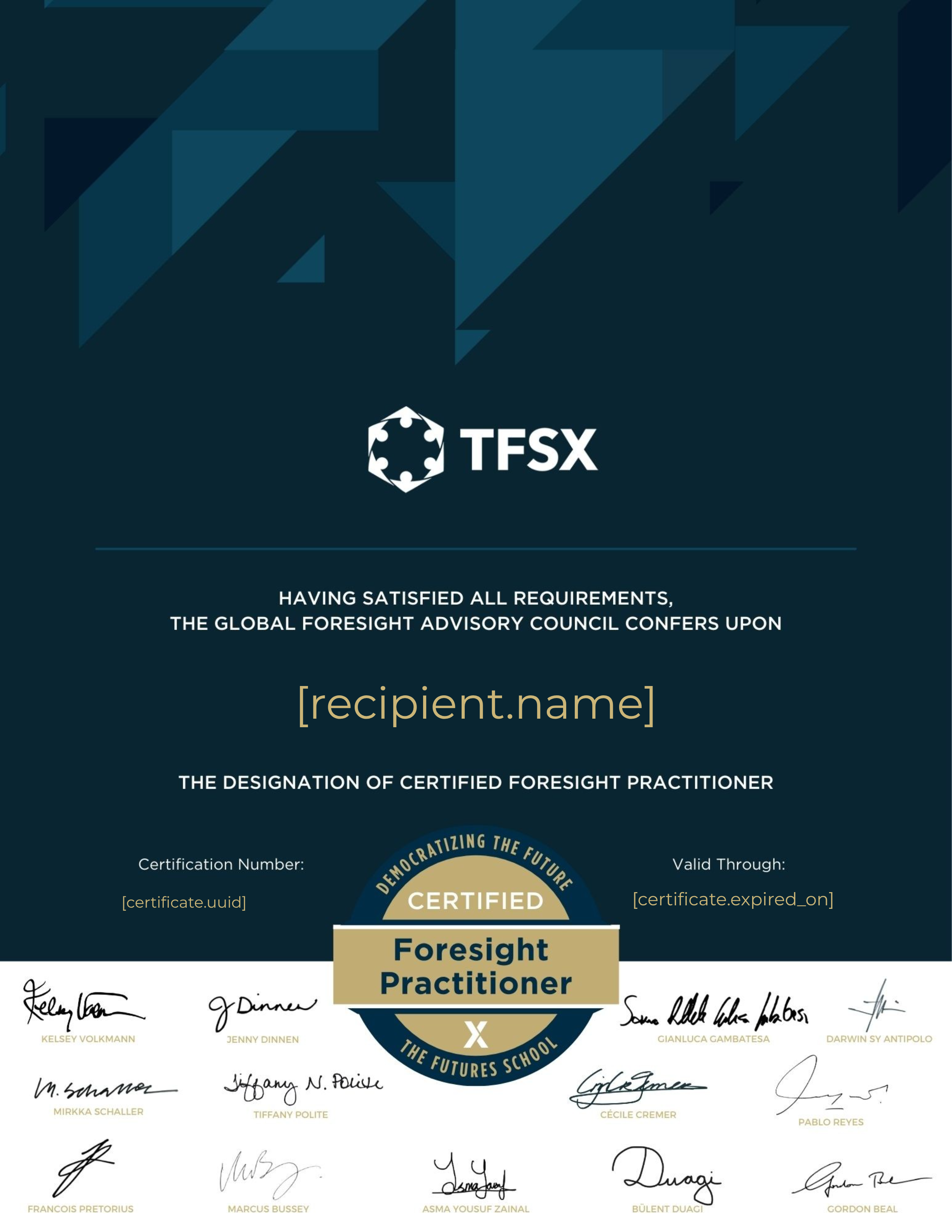 They have demonstrated proficiency of the material by earning an 80% or higher on the Certified Foresight Practitioner assessment.
